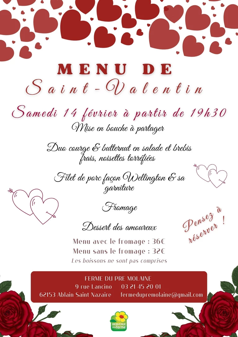 La ferme auberge vous propose une soirée spéciale 'Saint Valentin' le samedi 14 février à partir de 19h30. Menu ci-contre à découvrir. Pensez à réserver !